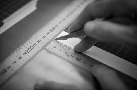 Met deze methode sla je de fase van het potlood over, je meet en snijdt tegelijk, heel vlug, heel perfect!